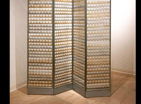 Each panel of this screen contains 35 acrylic tiles embedded with laser cut paper. Similar to the way a photograph is made by applying light through a negative version of itself, as one moves about the piece the tiles can seem to shift from positive to negative versions of themselves. The ashen and charred edges of the thin lines permit or restrict sight of the remaining slivers of white paper. As your position and the light changes, the tiles seem to shift in the same way that the lay of a silk carpet can cause a shift in its appearance according to point of view. To reinforce the play between positive and negative in the tiles, Max created a frame that uses the positive and negative force of ceramic neodymium magnets. The unusually strong magnets act as an invisible ‘hinge’ embedded within the frame that holds the panels upright and together or to another metal surface on a wall.